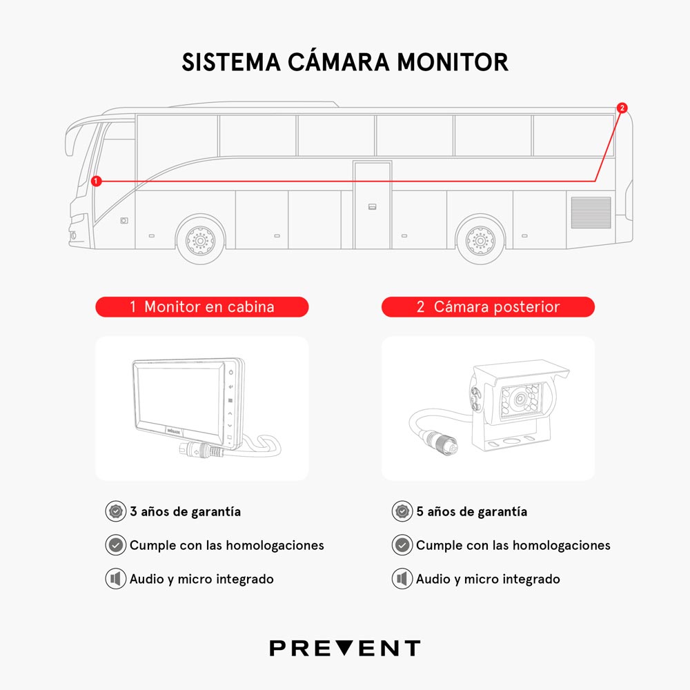 El sistema cámara/monitor de PREVENT es un dispositivo de videovigilancia que sirve para ayudar al conductor a visibilizar los puntos ciegos del vehículo o a mantener el control del perímetro en situaciones complejas durante la conducción.